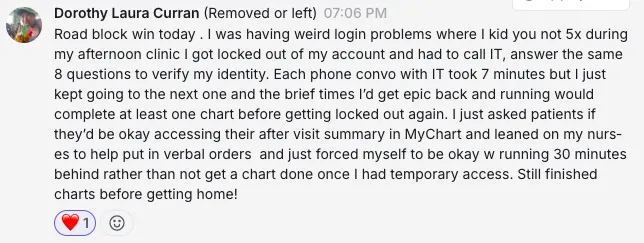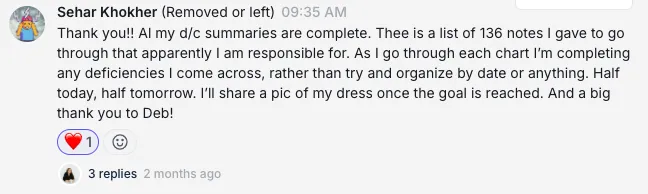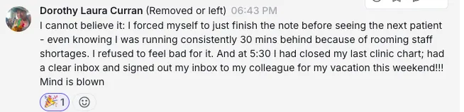“I’m at my daughter’s dance and all my notes are done. I got my labs cleared out this morning and messages answered and my reminders for the month are done!!!”