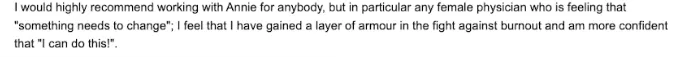 “I would highly recommend working with Annie for anybody, but in particular any female physician who is feeling that “something needs to change”; I feel that I have gained a layer of armour in the fight against burnout and am more confident that “I can do this!”